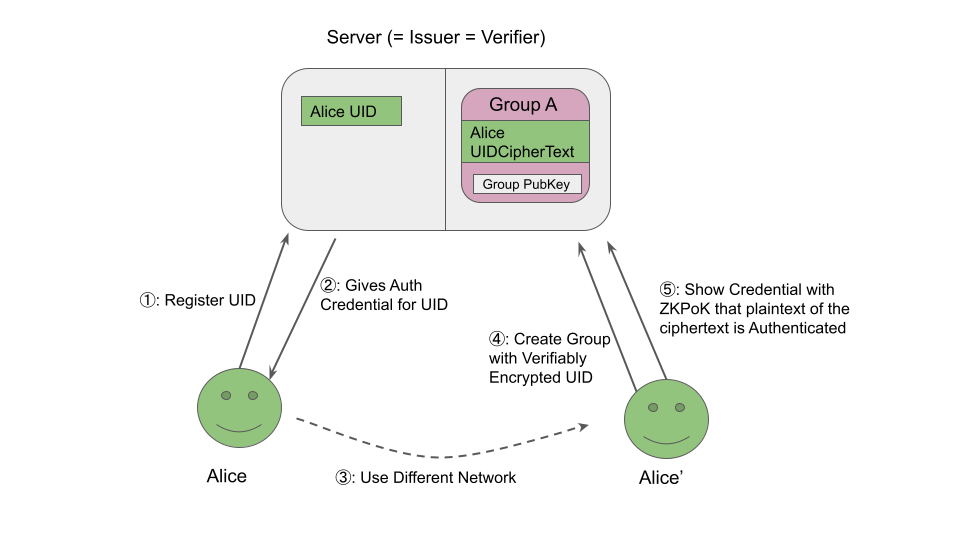 Server が、 Alice の UID とグループ内に存在する UID を紐付けられないよう、Alice は暗号化した UID をグループに登録しています。Server は暗号化した UID が既存の User のものであることを知る必要があるため、Alice は匿名証明書を提示してそのことを証明します。