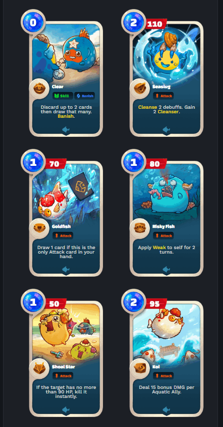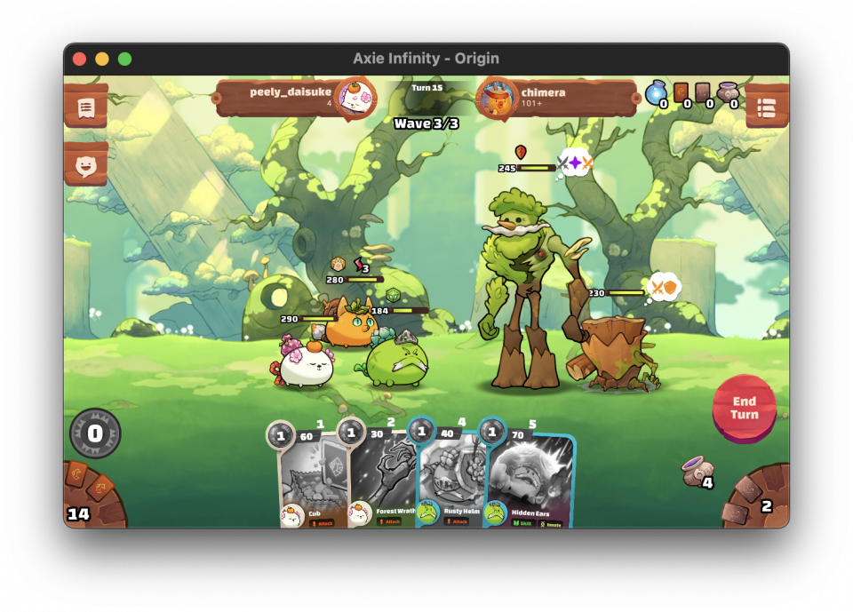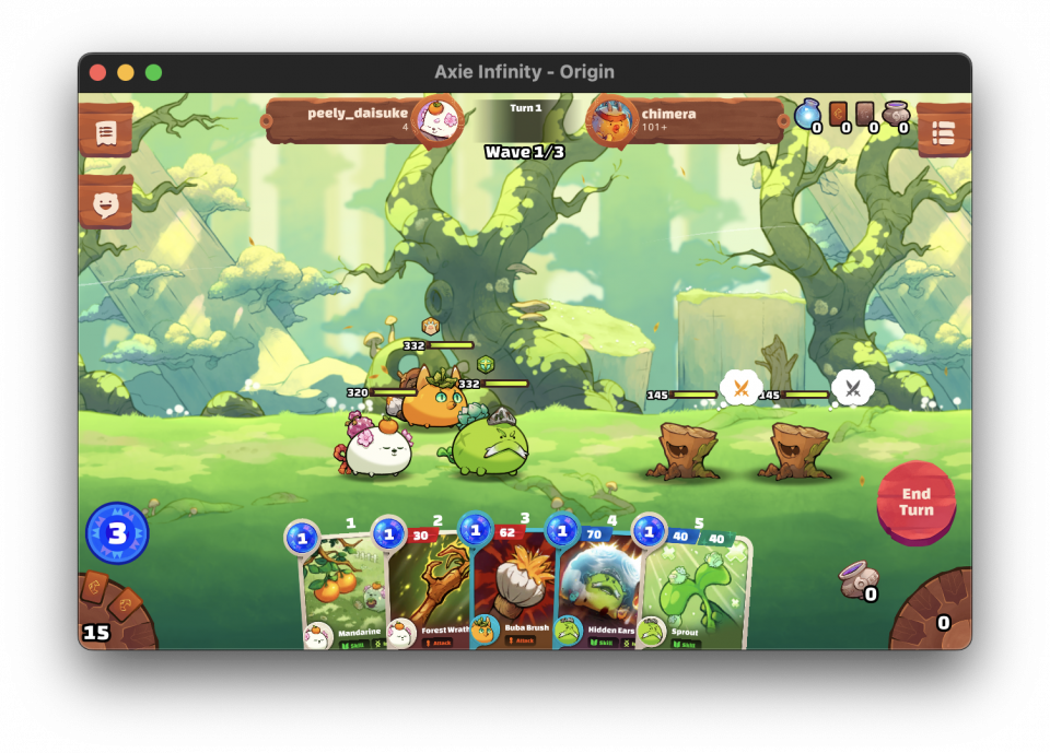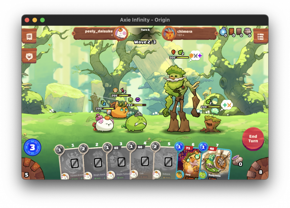 Axieを3体編成し、Axie固有の技を使用して対戦するゲームです。