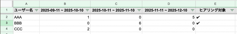 - 各期間で、何日分ヒアリング候補として集計されたかを↓のように確認できます
