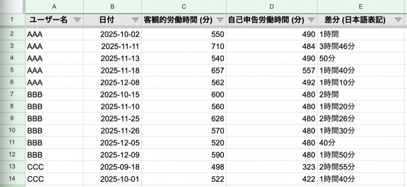 ForSpreadsheetsの例MonthlySummaryに集計する対象となった勤怠のレコードを1日分ずつ詳細を確認できるようになっています (一部のカラムを抜粋)- ※ユーザー名・日時・数値はすべてダミーデータです