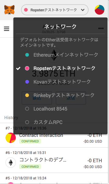 秘密鍵作成が完了したら、下の画像の通りネットワーク選択のドロップダウンメニューから Ropstenテストネットワーク を選択しておきます。