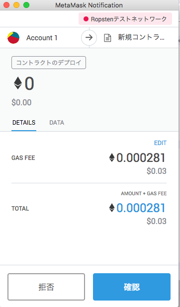 デプロイ ボタンを押すと下図のmetamaskの画面が表示されるので、 確認 ボタンを押します。