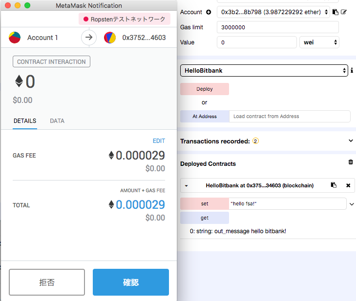 set の隣のテキストボックにダブルクウォートで囲った何か文字列を入れて set ボタンを押すと再度metamaskが開き確認 ボタンを押します。